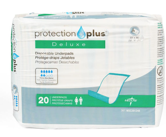 - Disposable underpads feature a combination fluff and polymer core for high absorbency and odor control